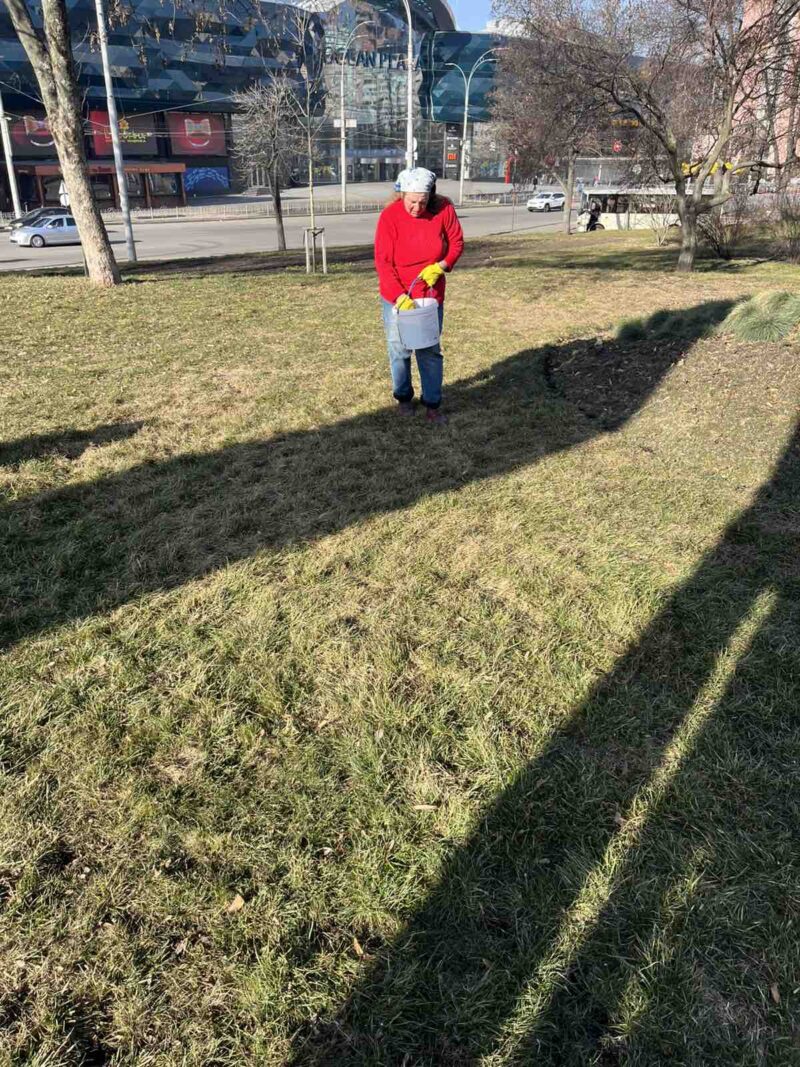 Працівники КП УЗН Голосіївського району проводять весняний догляд за газоном на території скверу Миру – підживлення ![]()